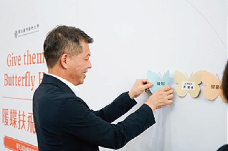 暖蝶振力飛舞 連淑錦陪伴高關懷學生展翅 (文、圖/海蝦)集結各界愛心的「暖蝶扶飛計畫」,於10/4下午假國立臺灣藝術大學多功能活動中心,舉辦「暖蝶展翅活動」,邀請各界善心人士、企業捐款單位蒞臨參與扶飛儀式。包括健豪印刷、聯河鋁業等企業界人士出席,校長鐘世凱(下圖)也出席貼上自己的蝴蝶。
