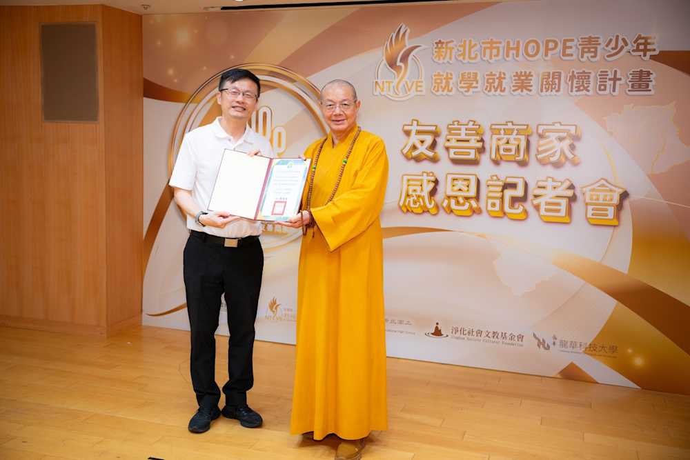 新北市教育局頒發友善廠商感謝狀 淨化文教基金會董事長釋淨耀法師致詞時,表示該基金會自109年承接方案,執行至今已累積追蹤2千餘名學生,累積41家友善商家,提供約3,200小時體驗時數,透過陪伴關懷、生涯探索課程及工作體驗3大面向協助國中畢業未定向的青少年找到希望,讓少年瞭解社會為其所做的努力,在輔導過程中不離不棄的引導少年復歸就學和就業,並給予少年努力後的新希望,更期待這群青少年能用行動表達感恩之心,能感受到社會關懷及友善企業的協助,期許感動的正向力量能永續循環。