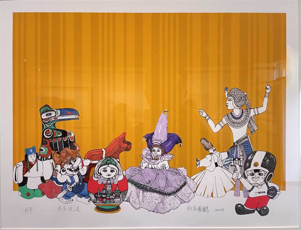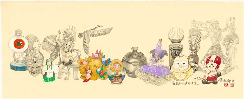 黃淑卿介紹上述作品說道,在旅行中所收藏的玩偶和尪仔,讓旅行的記憶與創作意圖互相應和。來自他國的尪仔成了書寫異國文化的出口,以及那份想望遠颺的心情。從左到右分別是:日本的鬼太郎故鄉所販賣的寶特瓶,馬來西亞面具、加拿大的印地安人頭像,吳哥窟的仙女、日本明治神宮的禮儀師,自製的香包,俄羅斯娃娃,馬拉威的木罐子,威尼斯的三角天使,宜蘭貓頭應音樂盒,墨西哥小雕像、埃及的蓪草畫,還有大同寶寶 。