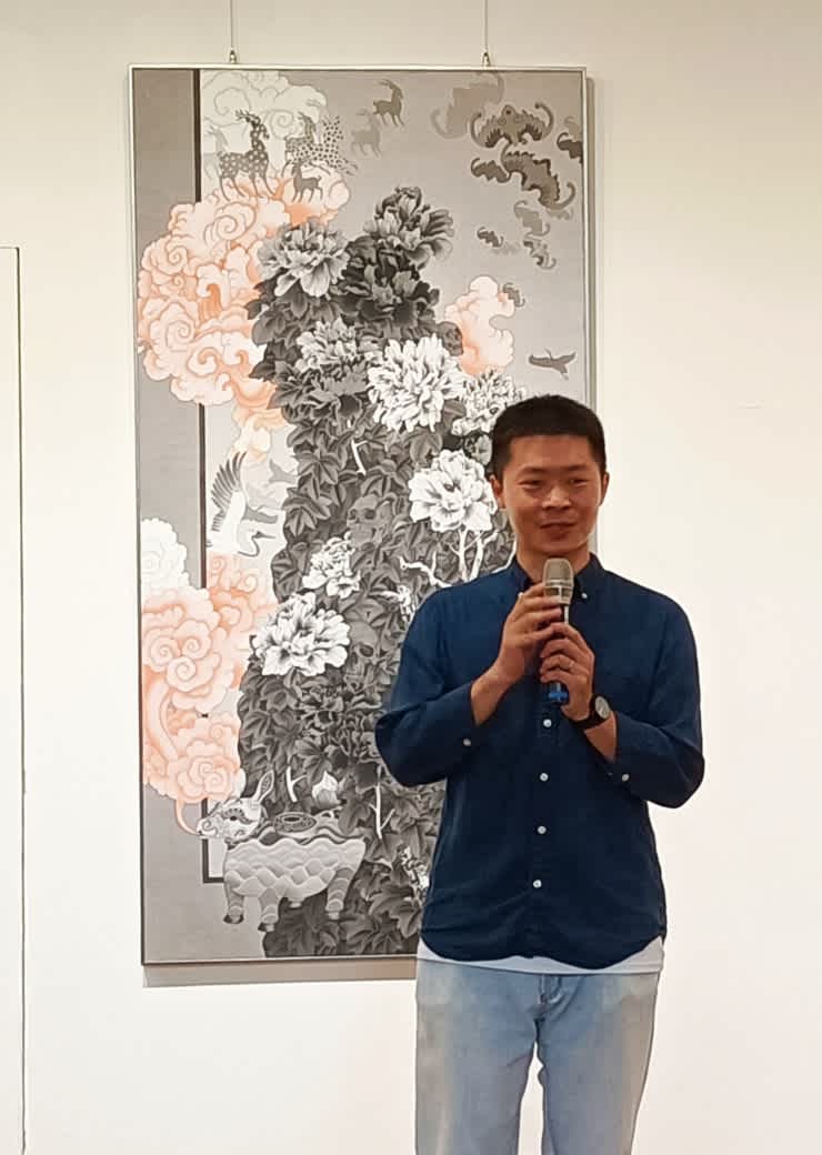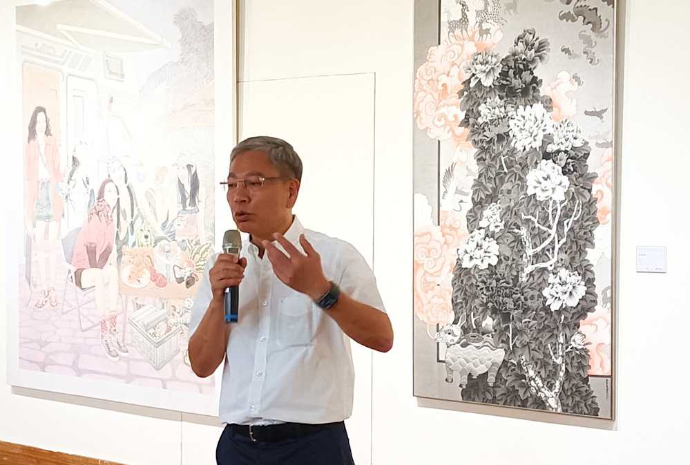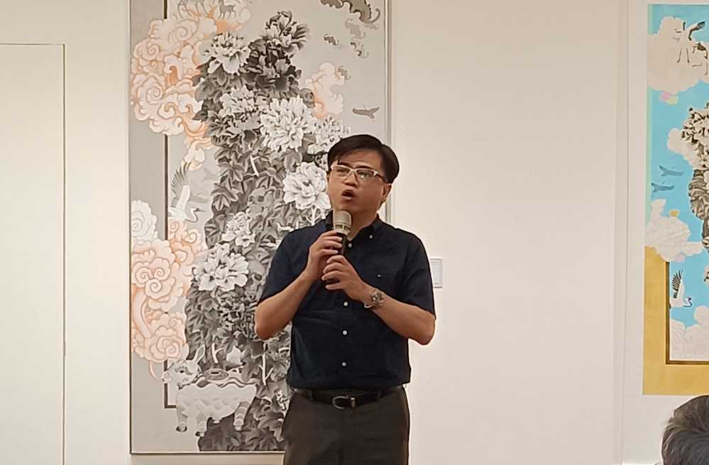 策展人台藝大書畫系主任陳炳宏(上)特別介紹,「同興營造創作獎學金-獎助培育人才計畫」專注於表彰台藝大書畫藝術學系的創作競賽優秀得獎者;與師大的「德鄰師大美術系獎助計畫─德鄰創作獎」,在過去幾年取得了豐碩的成果。 據了解,新北市板橋知名建築營造企業「同興營造工程股份有限公司」長期致力於城市建設,對新北市的居住美學和品質提升做出了重大貢獻。為了鼓勵在學青年投入藝術創作,培育未來的藝術人才,同興營造特別與國立臺灣藝術大學書畫系合作,設立了「同興營造創作獎學金」。該獎學金旨在支持書畫藝術學系的優秀學生,透過每年提供豐厚的獎學金,激勵他們從事藝術創作與研究。