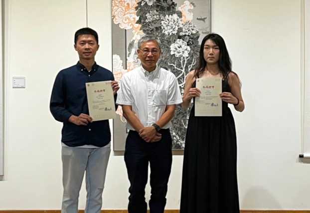 同興營造總經理葉錦發(中)頒發證書給二校代表,台藝大陳鈺守(左);台師大林品潔(右)