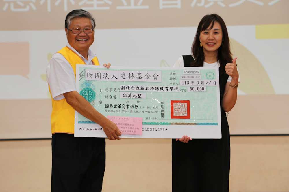 (前鋒傳媒)財團法人惠林教育基金會於113年9月27日下午,在新北特殊教育學校舉行113學年度上學期獎助學金頒獎典禮。此次活動共頒發了46.3萬元獎助學金,其中87位來自林口地區的國高中生及醒吾科技大學學生獲得清寒獎助學金,總金額達41.3萬元。此外,基金會還為特殊教育學校的社團提供了5萬元補助。
