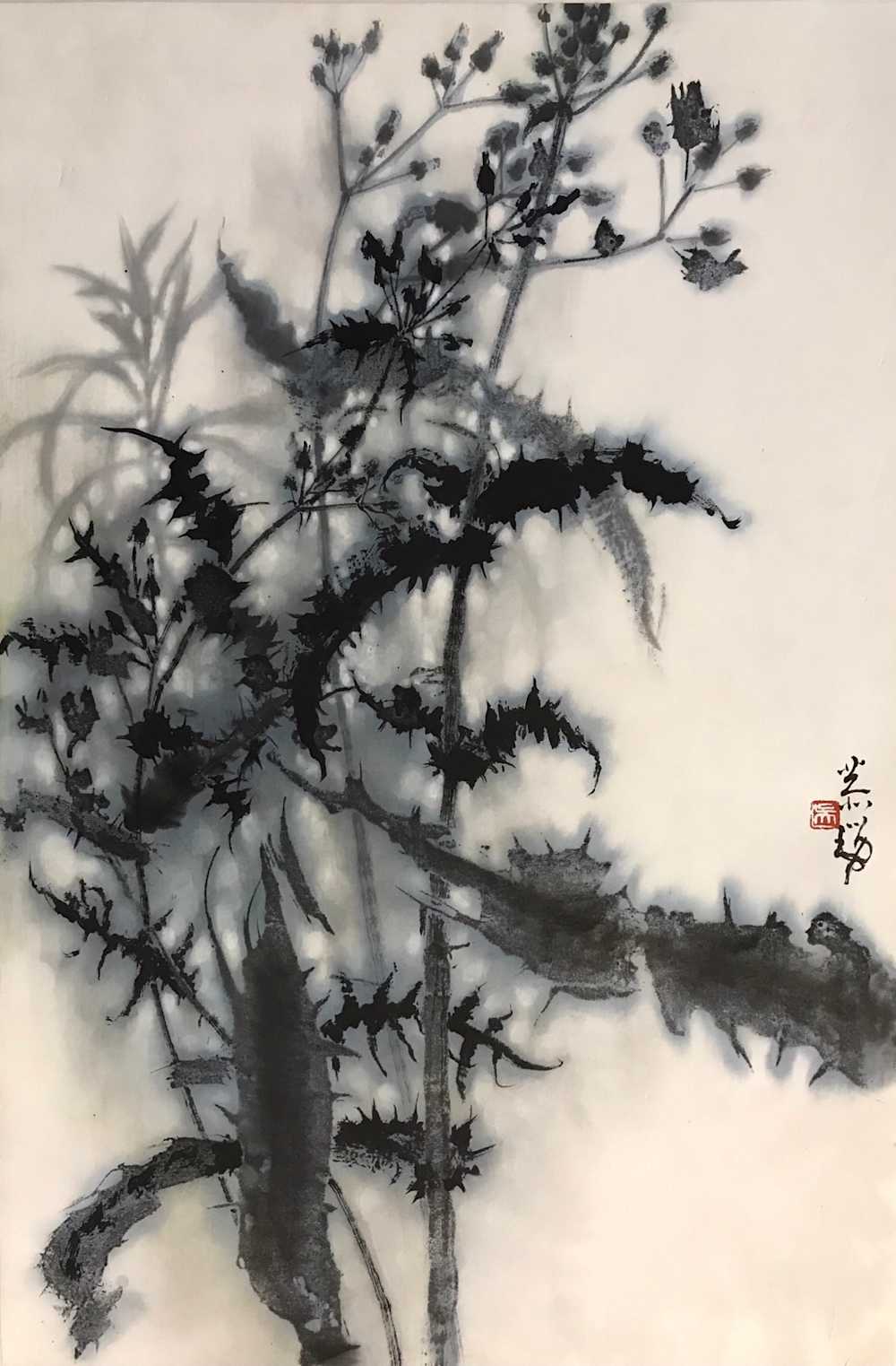 吳恭瑞 無華綻放(三) 69.5×46cm 水墨設色、宣紙2025 吳恭瑞教授現任教於國立臺灣藝術大學,專精水墨與當代書畫美學研究,作品風格清新靈動、設色雅緻,善於融合傳統筆墨與現代視覺語言,展現其「借古開今」的創作理念。其作品尤擅人物描繪與書意抒情,筆觸細膩、意境詩意,代表作如《讀畫記》、《春光乍洩》、《心象之間》,皆展現藝術家對當代人文思維的細緻關照。 在本次展出中,吳恭瑞呈現三類風格多樣的作品:水墨寫生小品:取材日常,表現情與景互動的感知經驗。